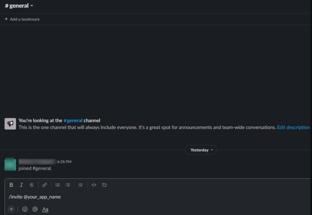 Step 13: Now Add your app to the channel by just typing “/invite @Your_App_Name” (use the app name that you want to connect with the channel) in channel chat.