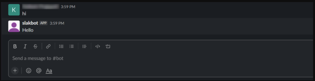 Then below is the code to check the message when the user says “hi” and the slack bot responds with “Hello”.