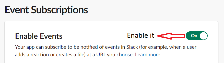 First off, all go to the Slack Developer Console in that go to “Event subscriptions” and Enable Events.
