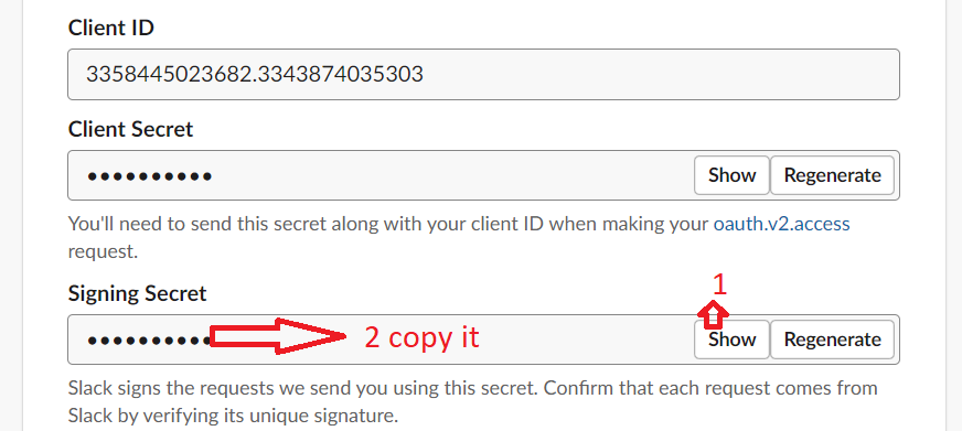 Step 18: Now again go to the Slack Developer Console. In that go to “Basic Information” in the left panel, then scroll down to “Signing Secret” copy it, and add it to the code.