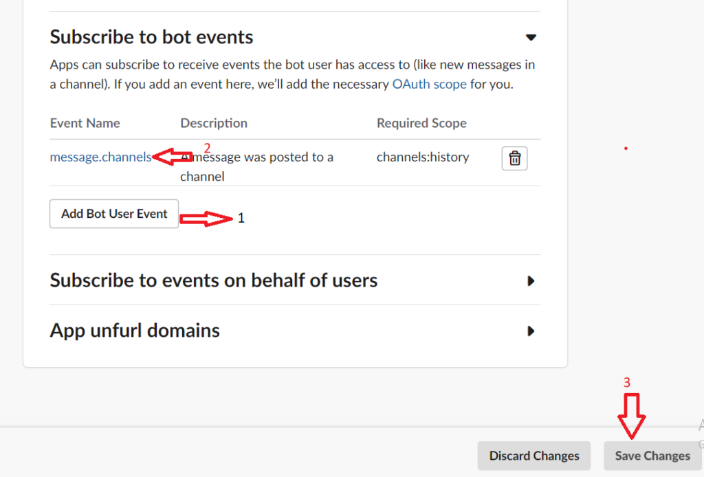 Step 21: After that scroll down and go to the “Subscribe to bot events” then go to “Add Bot User Events” and then add a message. channels to it.
