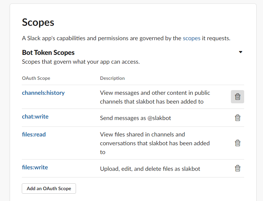 Step 22: Now go to “OAuths and Permission” and scroll down to “Scopes” there you will see that a scope name “channels: history” is added, if not then add it to the “Scopes”.
