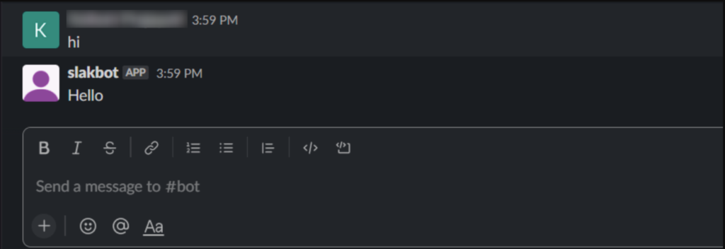 After running the code when we type “hi” in our channel, we will get the reply “Hello” from the bot.