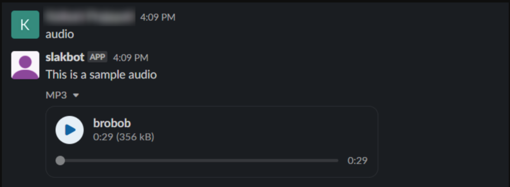 Now run the code, when we type “audio” in our channel then we will get the reply from the bot with audio that we have passed and when we type “file” in our channel then we will get the reply from the bot with a file that we have passed.