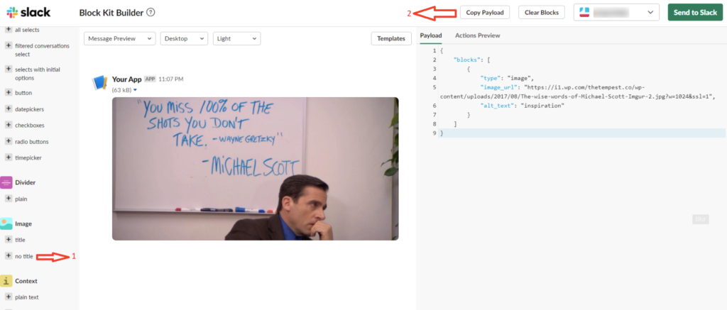 We can also get images by passing the image in different formats. Go to the website for the Slack Block Builder. There we can see a screen like this.