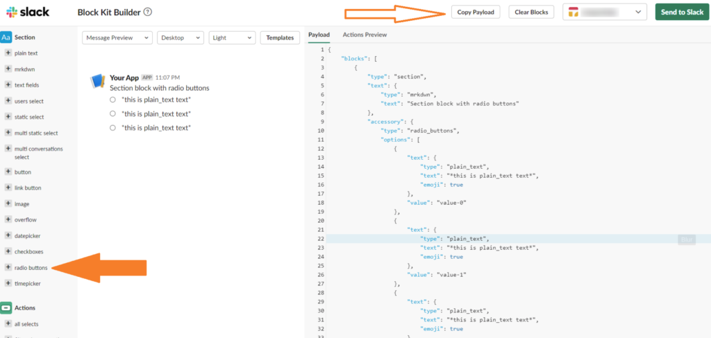 We can also add more responses and combine many responses together. To get the response we just need to create the payload from the website, copy the payload and paste it in the “blocks” section as we have done in the above code.