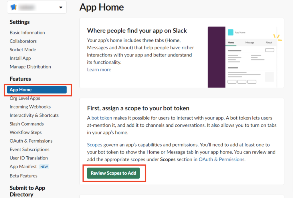 Step 6: Click on the “App Home” button and click on “Review Scopes to Add”.