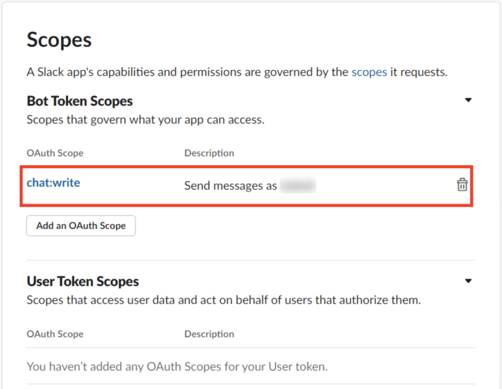 Step 7: After clicking on the “Review Scope to Add” button, scroll down and find the Scope section. Then click on the “Add an OAuth Scopes” Button under “Bot Token Scopes” and add “chat: write” as shown in the below image.