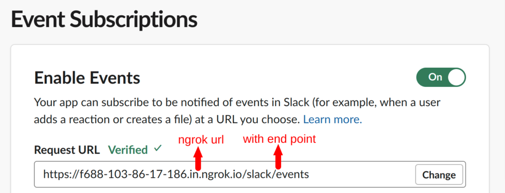 Now we need to again go to the Slack Developer Console, then go to Event Subscription and paste Ngrok URL with the endpoint that we define in the code.