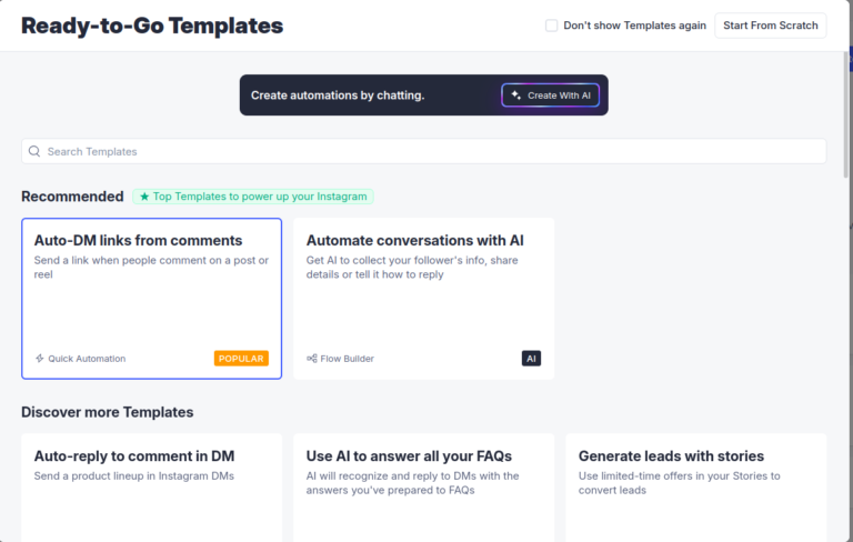 ManyChat provides several Ready-to-Go Templates for quick setup. If none meet your needs, click “Start from Scratch” to create a custom flow.