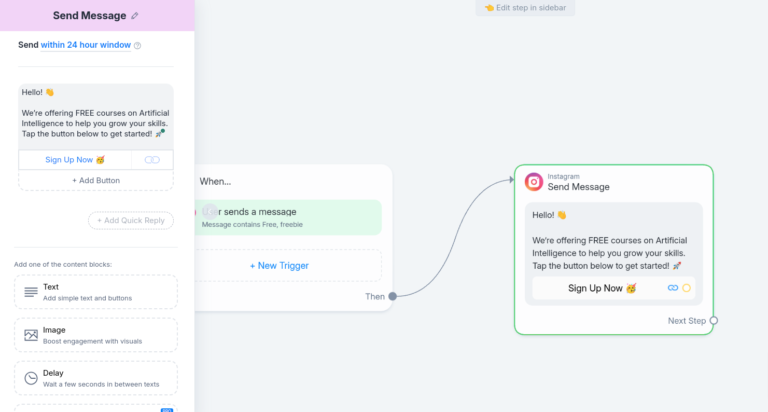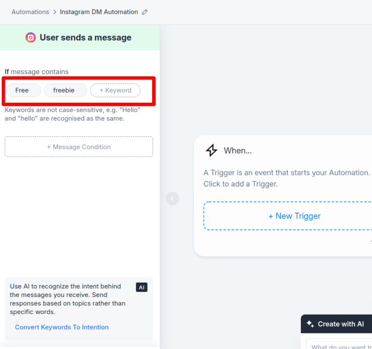 Let’s say you’re promoting free courses. You can create an automation where users who DM the words “Free” or “Freebie” automatically receive a message with a link to the courses. This ensures timely engagement and a seamless user experience, while also boosting your promotional efforts.