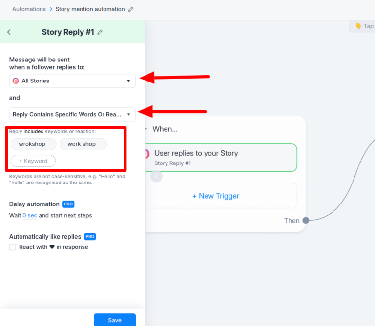 - Define the keywords you want the automation to detect in the story replies. These keywords will trigger your automated response when users reply to your story.