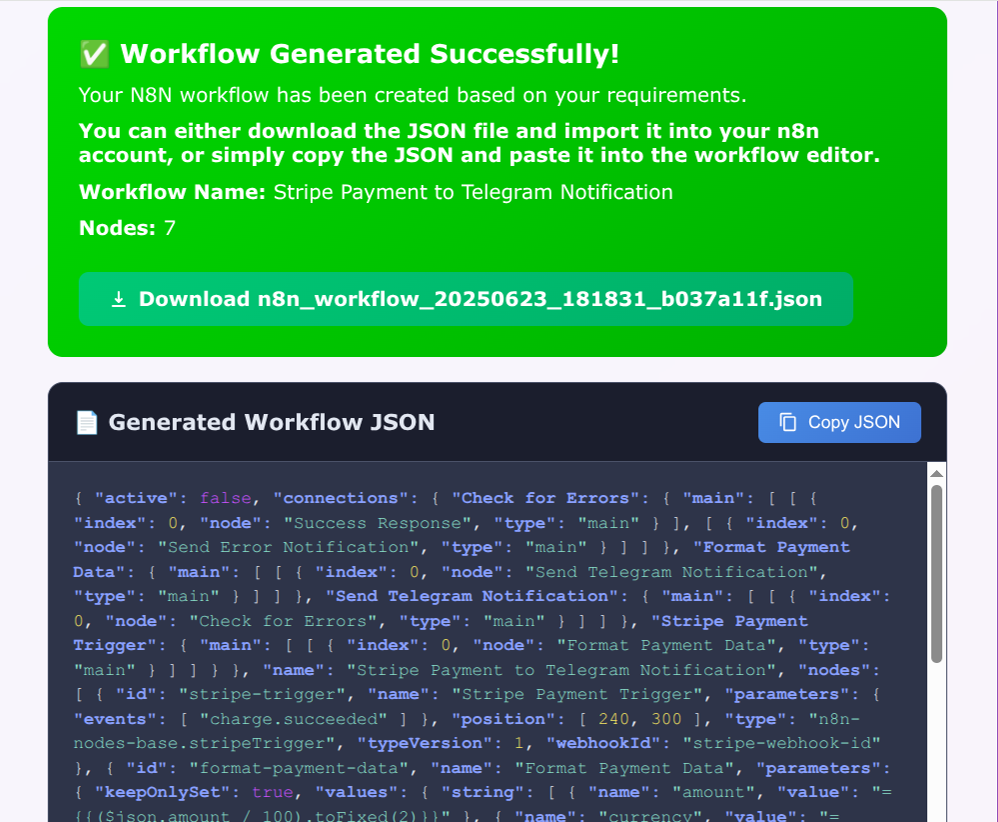 The tool provides your custom n8n workflow as a standard JSON file. You can easily copy this code or download the file directly, making it ready for immediate use.